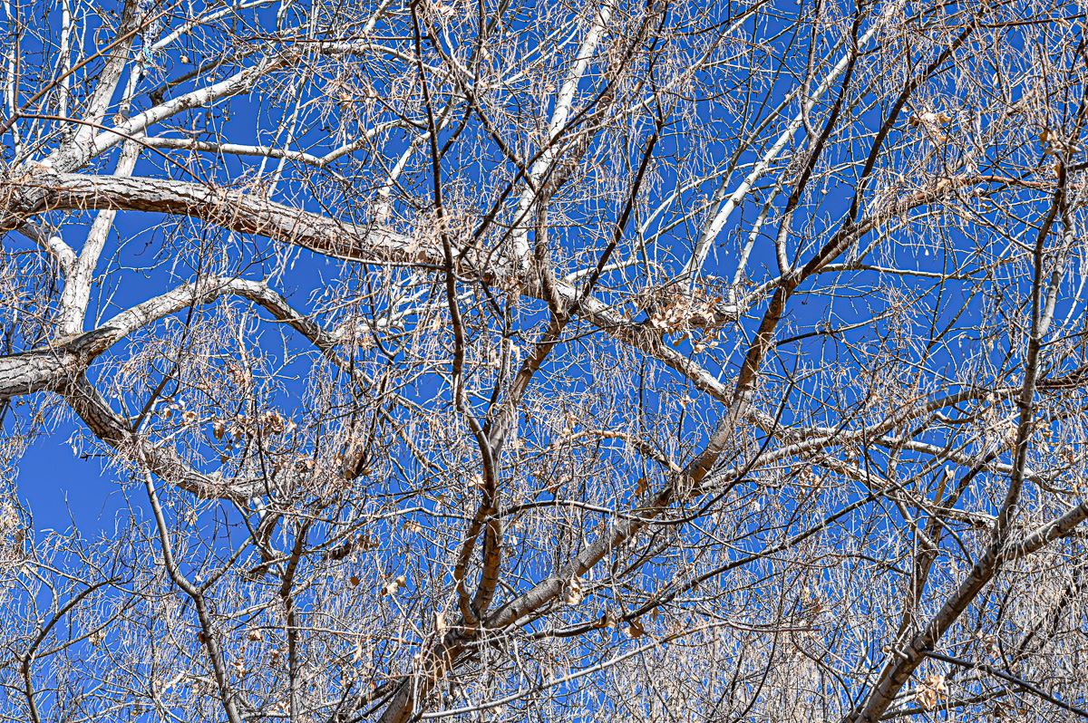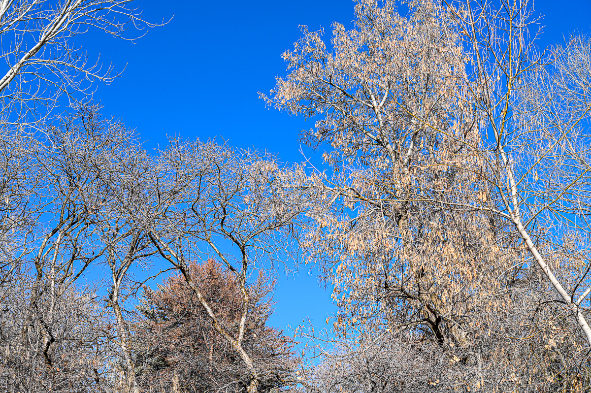 Notice the play of the trunks in the foreground and the play of their shadows in the background. The drab colors contradict the bright winter sun.